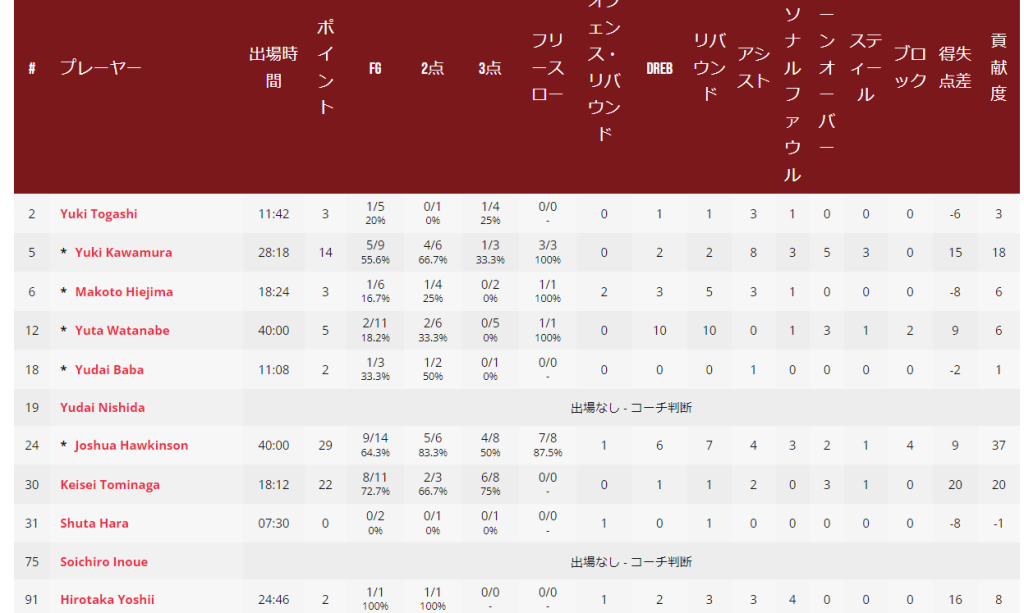 河村選手EFF27、比江島選手EFF23、渡邊選手EFF25と大爆発!退場寸前の比江島選手が驚異的なゾーン。シーズン開幕前でこれだけ調子を合わせてくるのが凄すぎる。