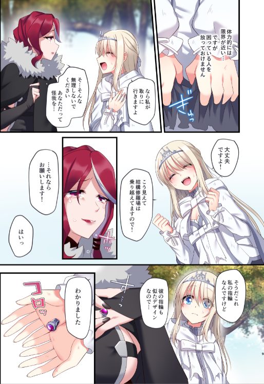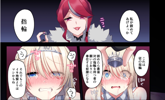 この女性の目論見は、ロザリエを絶頂させることであるものを得ることなのですが……それは本編で。女性はロザリエの前に姿を現して「この指輪をはめたら絶頂地獄からは解放される」「そのかわり、この指輪の対になる指輪を持っている者のド●イになる」ということを言われます。